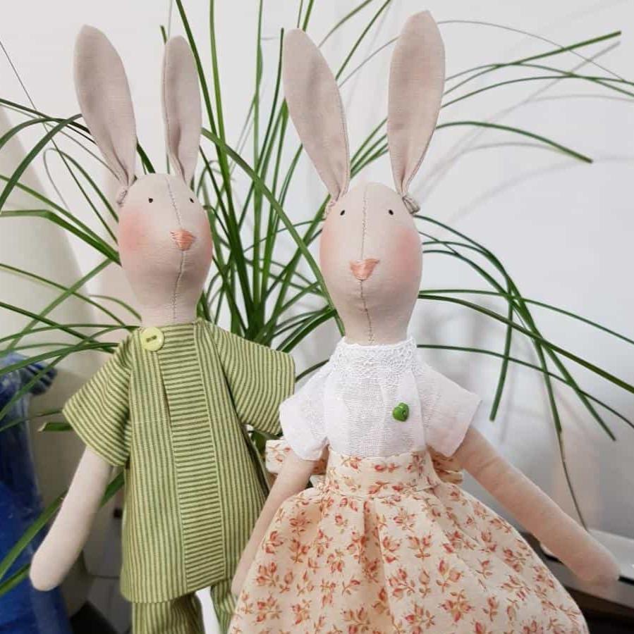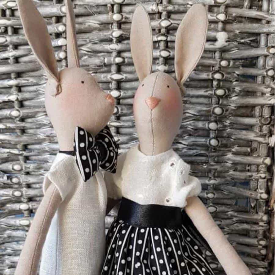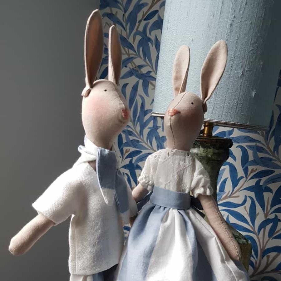 Garçon et fille de 32 cm. Rembourrage en fibre polyester anti acarien. Les vêtements réalisés dans des tissus de très belle qualité sont doublés lorsque cela est nécessaire. La dentelle utilisée est ancienne.