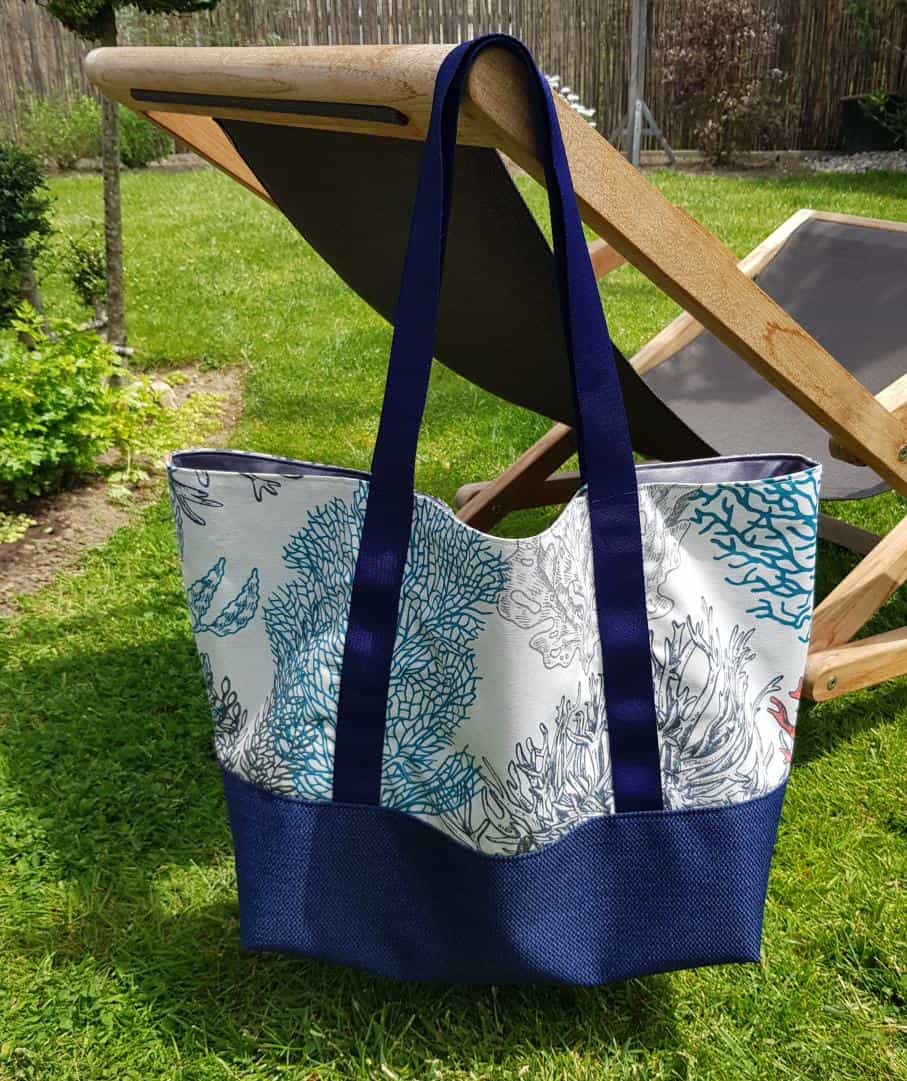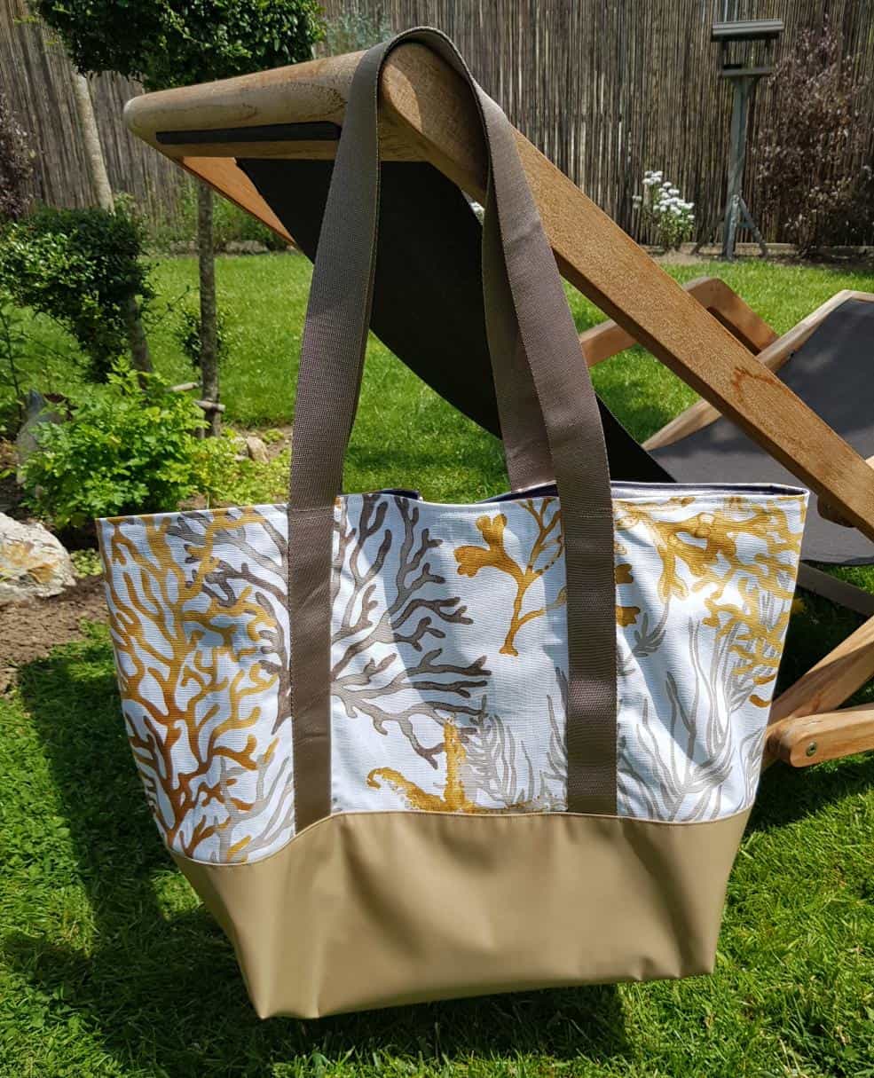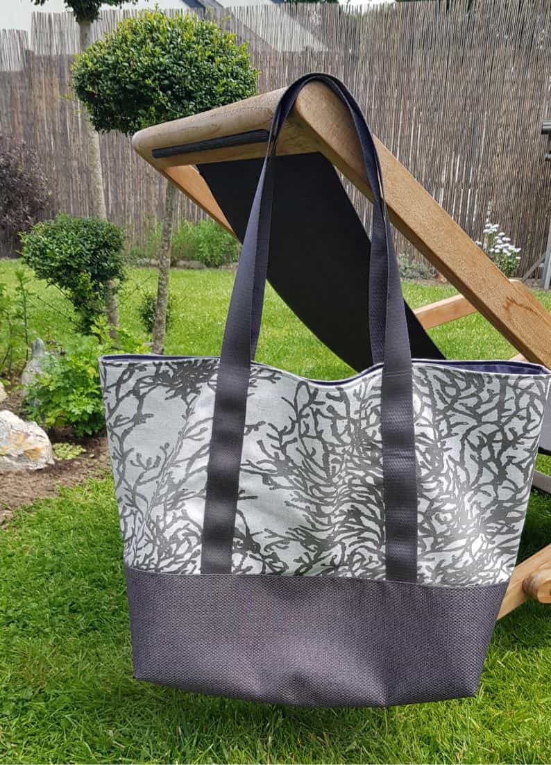 Ce sac est conçu pour répondre aux impératifs d’un sac de plage mais il peut aussi jouer le rôle d’un fourre tout XXL très chic. L’extérieur est en coton enduit imprimé alors que la doublure est en PUL gris acier. Le PUL est un tissu souple, flexible, résistant et imperméable.